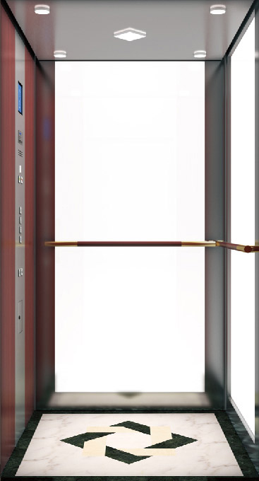 选配 吊顶: D58066(镜面不锈钢,LED灯饰) 轿壁: 后壁及一侧壁发纹不锈钢边框观光玻璃,另一侧壁木饰面化妆钢板,前壁发纹不锈钢 扶手: D77007(钛金不锈钢圆扶手,中间实木) 地板: D62069-D(大理石)/D62069-P(PVC)