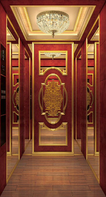 选配 吊顶: D58085(木质饰面,内嵌水晶铜灯) 轿壁: 后壁中间板木质造型框内嵌木饰面,钛金镜面蚀刻不锈钢,辅助板钛金镜面不锈钢;侧壁中间板是木质造型框,钛金镜面不锈钢,辅助板木饰面;前壁木饰面 扶手:无 地板:柚木地板(D63070)