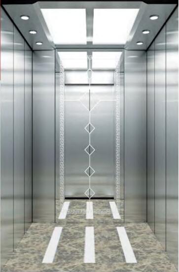 吊顶:镜面不锈钢框架配亚克力灯饰,筒灯 轿壁:后壁中问板镜面蚀刻不锈钢,后壁辅助板及两侧壁发纹不锈钢,前壁发纹不锈钢 扶手:无 地板: PVC