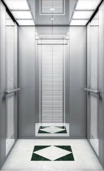 吊顶:镜面不锈钢框架,亚克力灯饰,简灯 轿壁:三侧轿壁中间板镜面蚀刻不锈钢,辅助板发纹不锈钢,前壁发纹不锈钢 扶手:发纹不锈钢圆扶手 地板: PVC