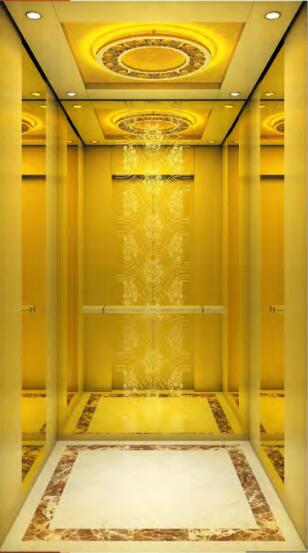 吊顶:钛金发纹不锈钢框架,中间贴金箔 纸及造型设计 轿壁:后壁整块钛金镜面蚀刻不锈钢, 两侧壁中间板钛金镜面不锈钢,辅助板钛 金发纹不锈钢;前壁钛金发纹不锈钢 扶手:圆形透明有机柱扶手 地板: PVC
