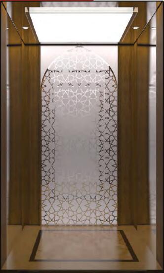 吊顶:镜面不锈钢边框,亚克力, LED射灯 轿壁:后壁中间板镜面蚀刻不锈钢,辅助板木饰面; 侧壁中间板境面不锈钢,辅助板木饰面;前壁镜面不锈钢 扶手:无 地板:大理石