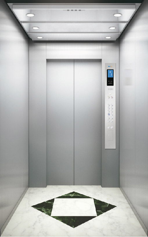 吊顶: D58033 (镜面不锈钢框架配筒灯) 轿壁:发纹不锈钢 轿门:发纹不锈钢 地板: D61011-P (PVC) 操纵箱: D36237 基站门套:发纹不锈钢小门套 基站厅门:发纹不锈钢 其他层厅门和门套:喷涂钢板厅门和小门套