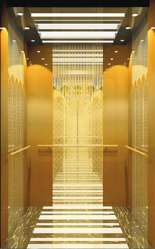 吊顶: D58018(镜面不锈钢框架,亚克力灯饰,LED灯,筒灯数量根据轿厢实际大小增减) 轿壁: 三侧轿壁中间板钛金镜面蚀刻不锈钢,辅助板钛金发纹不锈钢,前壁钛金发纹不锈钢 轿门: D20722(钛金镜面蚀刻不锈钢) 扶手: D77009(钛金镜面不锈钢) 地板: D62020-D(大理石)