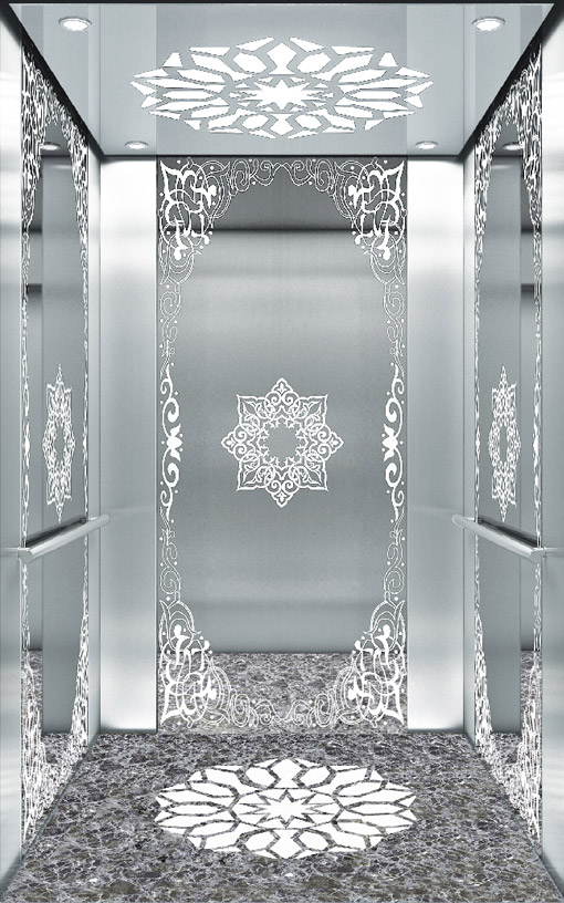 吊顶: D58050(镜面不锈钢框架配筒灯,筒灯数量根据轿厢实际大小增减) 轿壁: 三侧轿壁中间板镜面蚀刻不锈钢;辅助板发纹不锈钢;前壁发纹不锈钢 轿门: 镜面不锈钢 扶手: D77005(发纹不锈钢圆扶手) 地板: D61038-P(PVC)