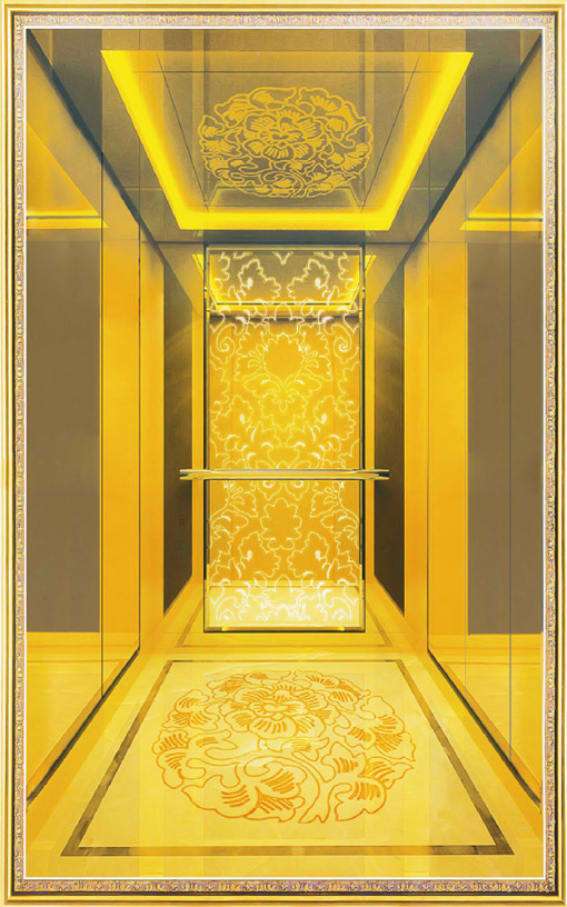 吊顶: D58039(钛金镜面不锈钢,中间配蚀刻花纹,四周配黄色灯圈) 轿壁: 侧壁钛金镜面不锈钢,后壁中间板钛金镜面蚀刻不锈钢,辅助板钛金镜面不锈钢;前壁钛金镜面不锈钢轿门:钛金镜面不锈钢 后壁扶手: D77009(钛金镜面不锈钢圆扶手) 地板: D62035-D(大理石)