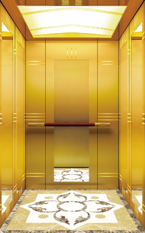 吊顶: D58019(钛金镜面不锈钢框架,宽幅拱形白色透光板) 轿壁: 钛金、镜面、蚀刻、发纹 轿门: D20710(钛金镜面蚀刻不锈钢) 后壁扶手: D77011(钛金镜面不锈钢圆管,中间实木) 地板: D61056-P(PVC)