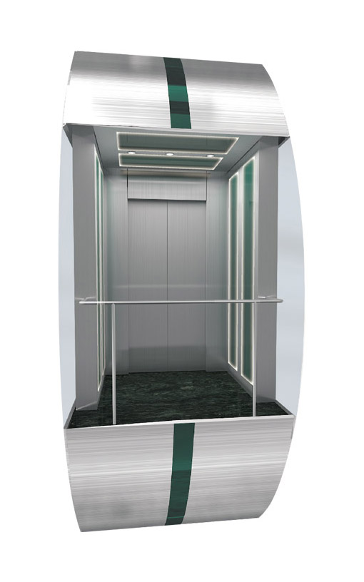 上下罩: 发纹不锈钢,镜面不锈钢观光壁:夹胶玻璃(发纹不锈钢边框) 装饰顶: 不锈钢框架,亚克力,灯带,筒灯轿厢壁:发纹不锈钢框架,磨砂玻璃,灯带 扶手: 不锈钢圆管扶手 地板: PVC(可选配大理石)