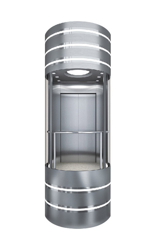 上下罩: 不锈钢蚀刻,亚克力 观光壁: 夹胶玻璃(发纹不锈钢边框) 装饰顶: 钢板烤漆,亚克力灯饰,LED灯 轿厢壁: 发纹不锈钢 扶手: 不锈钢圆管扶手 地板: PVC(可选配大理石)