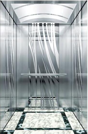 吊顶:镜面不锈钢框架,亚克力拱顶板 轿壁:三侧桥壁中间板镜面蚀刻不锈钢,辅助板发纹不锈钢,前壁发纹不锈钢 扶手:发纹不锈钢圆扶手 地板: PVC