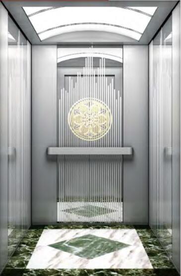 吊顶:镜面不锈钢框架,亚克力拱顶板 轿壁:后壁中间板镜面蚀刻不锈钢+喷金上色图案, 辅助板发纹不锈钢;侧壁中问板镜面蚀刻不锈钢, 辅助板发纹不锈钢;前壁发纹不锈钢 扶手:发纹不锈钢扁扶手 地板: PVC