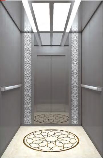 吊顶:镜面不锈钢框架配亚克力透光板 轿壁:后壁中间板镜面不锈钢,辅助板发纹蚀刻不锈钢,侧壁及前壁发纹不锈钢 扶手:发纹不锈钢扁扶手 地板: PVC