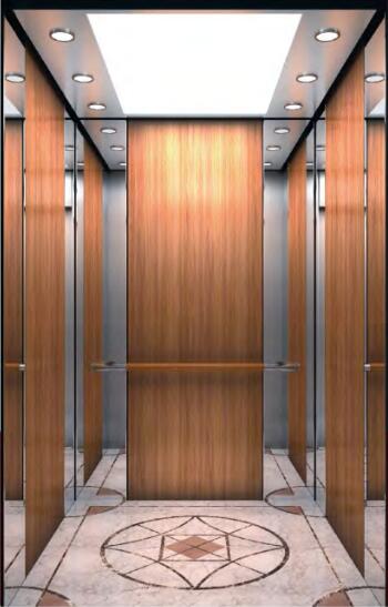 轿壁;三侧桥壁中问板木纹饰板。辅助板镜面不锈钢。前壁镜面不锈钢