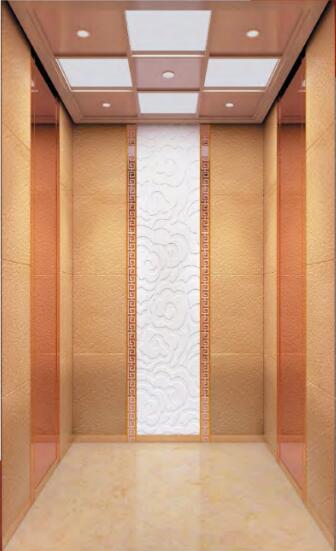 轿壁:后壁中间板工艺木饰面和玫瑰金镜面蚀刻不锈钢边框,辅助板皮革硬包,侧