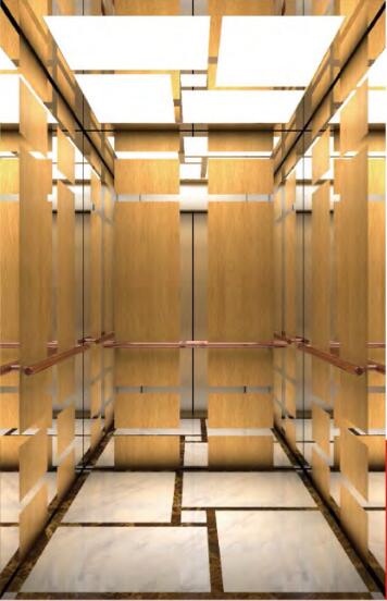 吊顶:镜面不锈钢,异形造型,有机透光板 轿壁:三侧轿壁中间板木饰面嵌镜而不锈钢条, 辅助板镜面不锈钢,前壁境面不锈钢 扶手:玫瑰全圆管扶手 地板:大理石