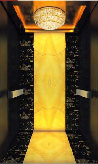 吊顶:钛金发纹不锈钢,中间配水晶吊灯,四周配黄色灯圈 轿壁:后壁透光大理石板;侧壁钛黑发纹不锈钢;前壁钛黑发纹不锈钢 扶手:发纹不锈钢扁扶手 地板:透光大理石板