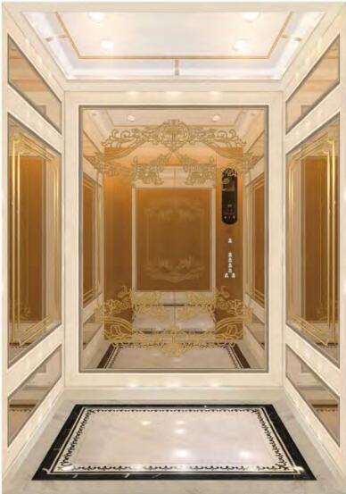 吊顶:木质造型框,筒灯 轿壁:后壁为香槟金镜面蚀刻不锈钢和木质造型框, 侧壁为木质造型框,香槟金镜面不锈钢和香槟金镜面 蚀刻不锈钢,前壁香槟金镜面不锈钢 扶手:无 地板:大理石