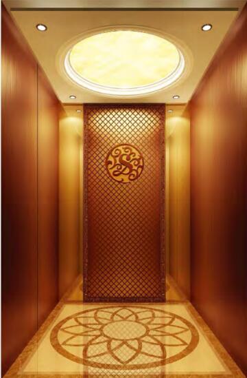 吊顶:木质造型顶,透光云石,LED灯 轿壁:后壁中间板古铜色镜面蚀刻不锈钢。辅助板古 铜色镜而不锈钢,两侧壁及前壁古铜色发纹不锈钢 扶手:无 地板:大理石