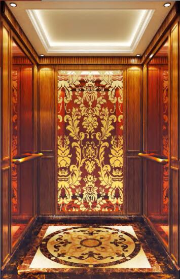 吊顶:木质造型顶,中间银箔贴膜,暗藏柔和光源,四周LED灯 轿壁:后壁中间板木质造型配玫瑰金镜面蚀刻不锈钢,辅助板木饰面; 侧壁中间板木质造型配玫瑰金镜面不锈钢。辅助板木饰面,前壁玫瑰金镜面不锈钢 扶手:圆木扶手 地板: PVC