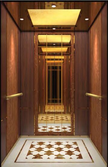 吊顶:钛金镜面不锈钢,金箔, LED回光灯带,LED简灯 轿壁:后壁木饰面,钛金镜面不锈钢装饰条,车刻茶镜,皮革硬包; 侧壁木饰面,钛金镜面不锈钢装饰条,皮革硬包;前壁钛金镜面不锈钢 扶手:钛金发纹不锈钢 地板:大理石