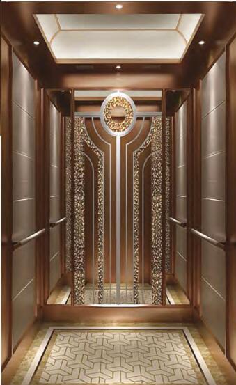 吊顶:古铜色镜面不锈钢框架,上层白色烤漆顶板暗藏灯光 轿壁:后壁中间板古铜色浮雕板,辅助板古铜色镜面不锈钢; 侧壁中心皮革硬包.辅助板古铜色发纹不锈钢,三侧轿壁古铜色发纹不锈钢踢脚线 扶手:古铜色发纹不锈钢圆扶手 地板:大理石