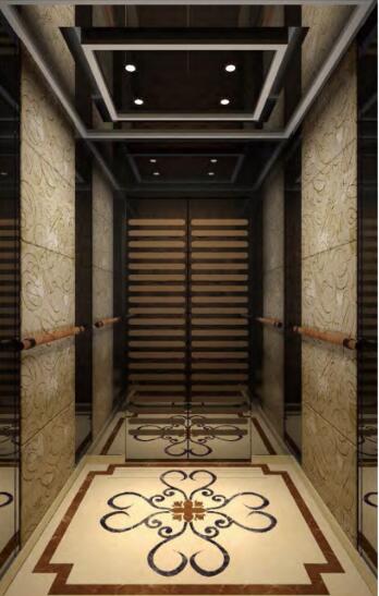 吊顶:钛黑镜面不锈钢,白色喷漆边框,筒灯 轿壁:三侧轿壁中间板拼花瓷砖,辅助板钛黑镜面不锈钢,前壁钛黑镜面不锈钢 扶手:实木扶手 地板:大理石