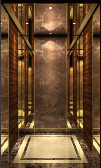 吊顶:古铜色烤漆钢板,镜面不锈钢,筒灯 轿壁:后壁中间板彩纹钢板,辅助板钛金镜面不锈钢, 侧壁中间板木饰面.辅助板钛金镜面不锈钢,前壁钛金镜面不锈钢 扶手:无 地板: PVC