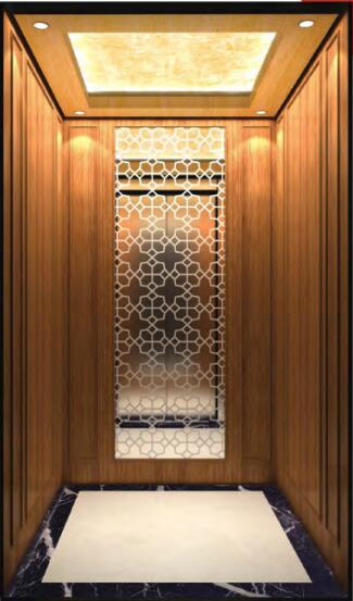 吊顶:木质框架,顶部贴金箔, LED筒灯,回光灯带 轿壁:后壁木饰面,镜面蚀刻不锈钢;l侧壁木饰面;前壁木饰面 扶手:无 地板:大理石
