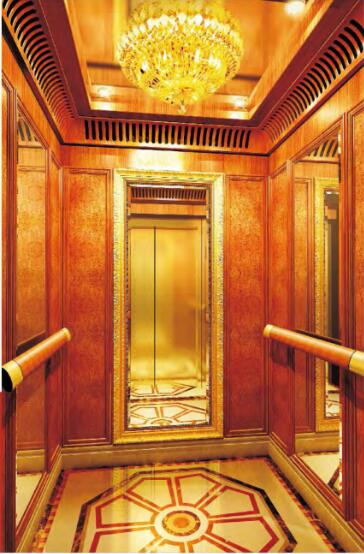 吊顶:实木楼空造型边框,钛金镜面不锈钢,筒灯,灯水晶吊灯 轿壁:后壁仿红木饰面,镜子,金箔线条;侧壁仿红木饰面。镜子;前壁汰金镜面不锈钢 扶手:钛金和实木椭医形组合扶手 地板:大理石