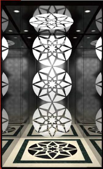 吊顶:镜面不锈钢,亚克力透光板设计,筒灯 轿壁:后壁镜面蚀刻不锈钢,其余侧壁镜面不锈钢 扶手:无 地板: PVC